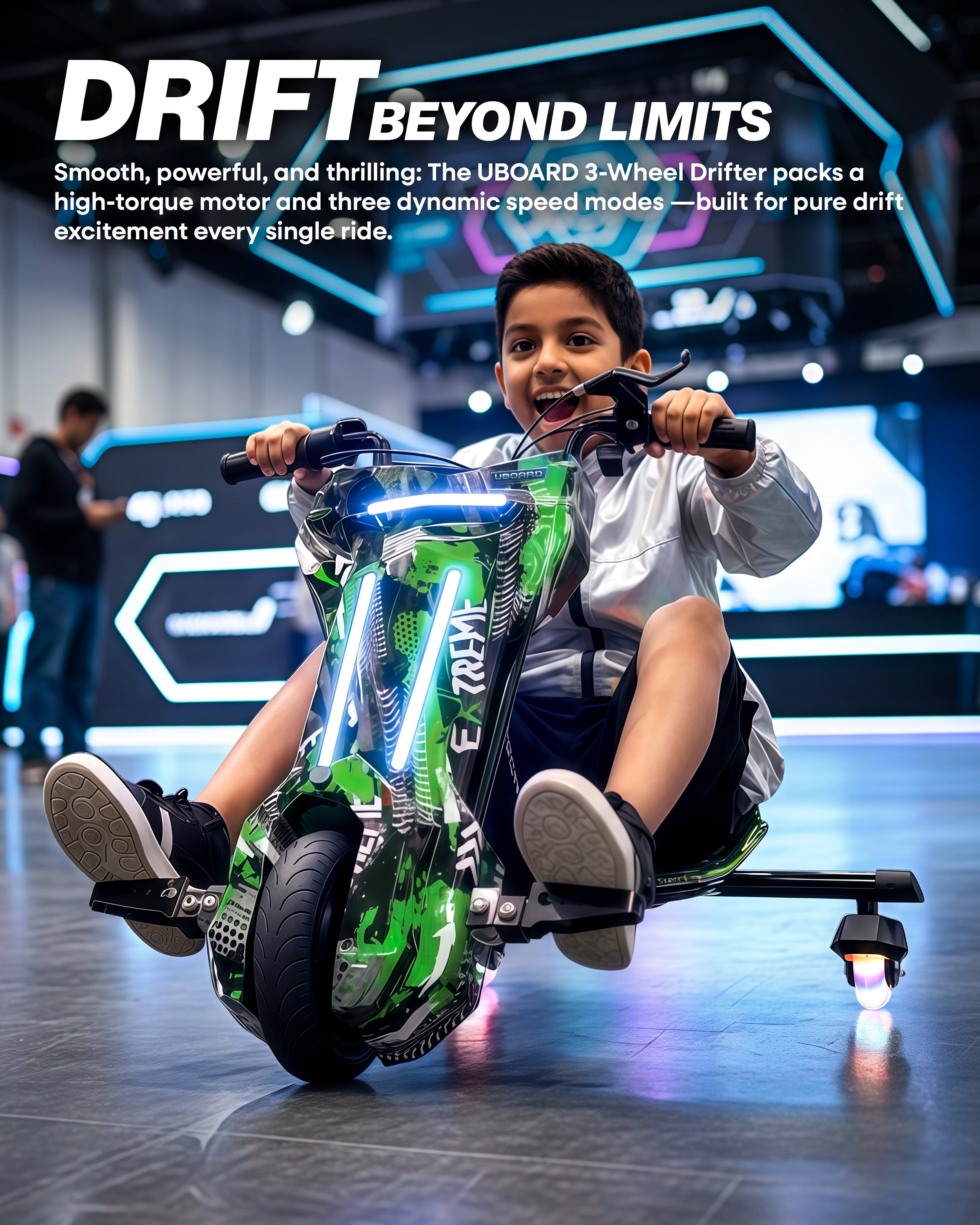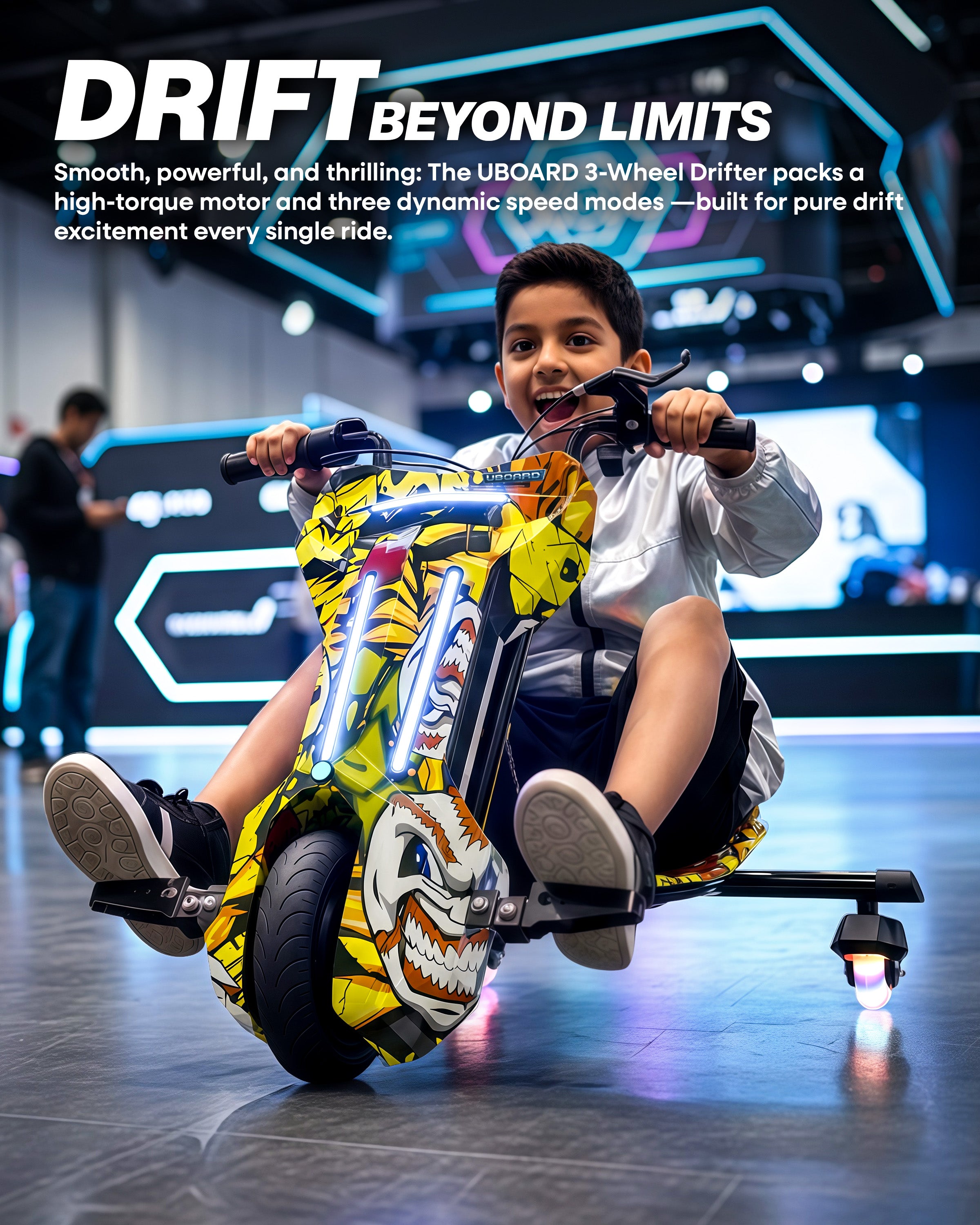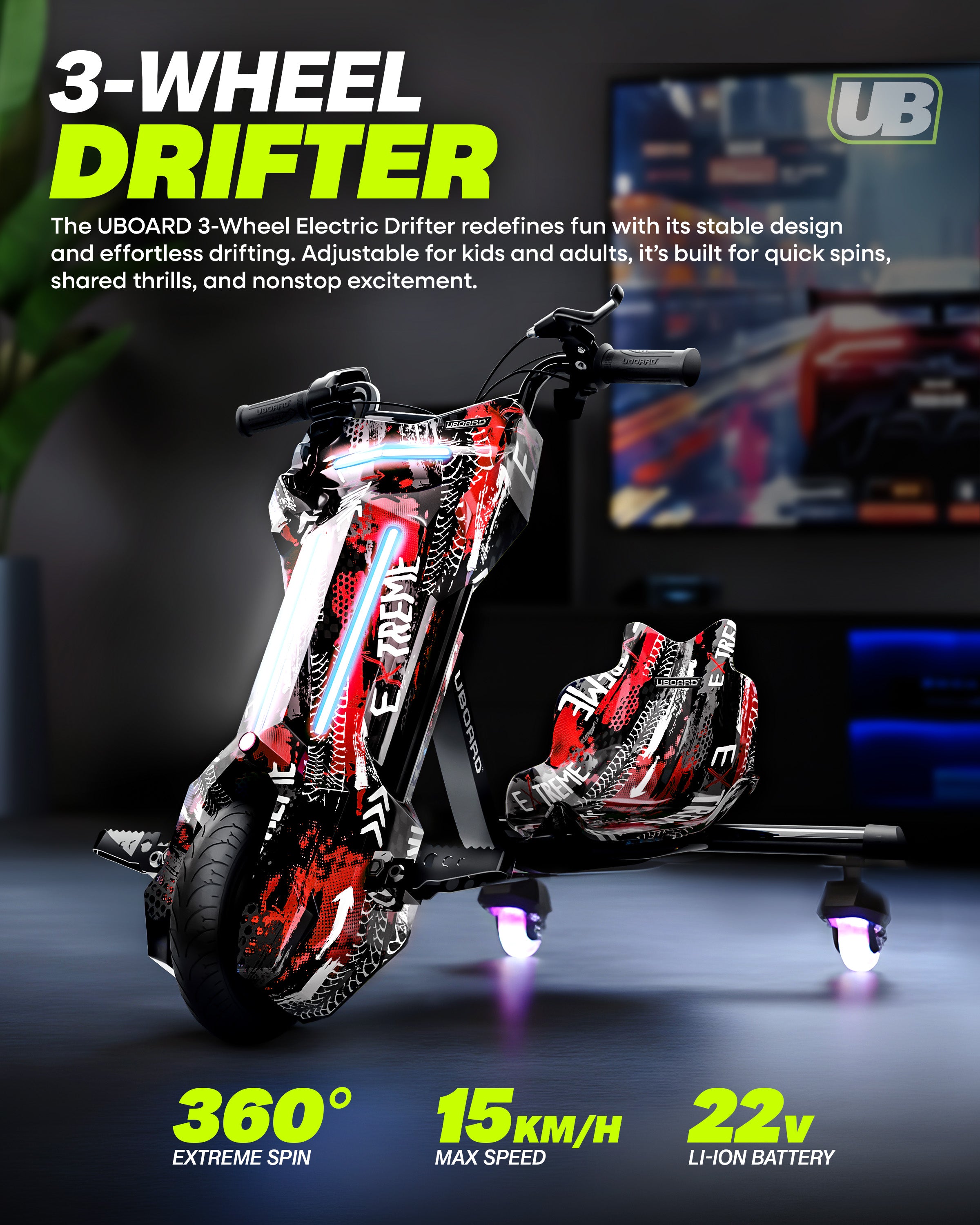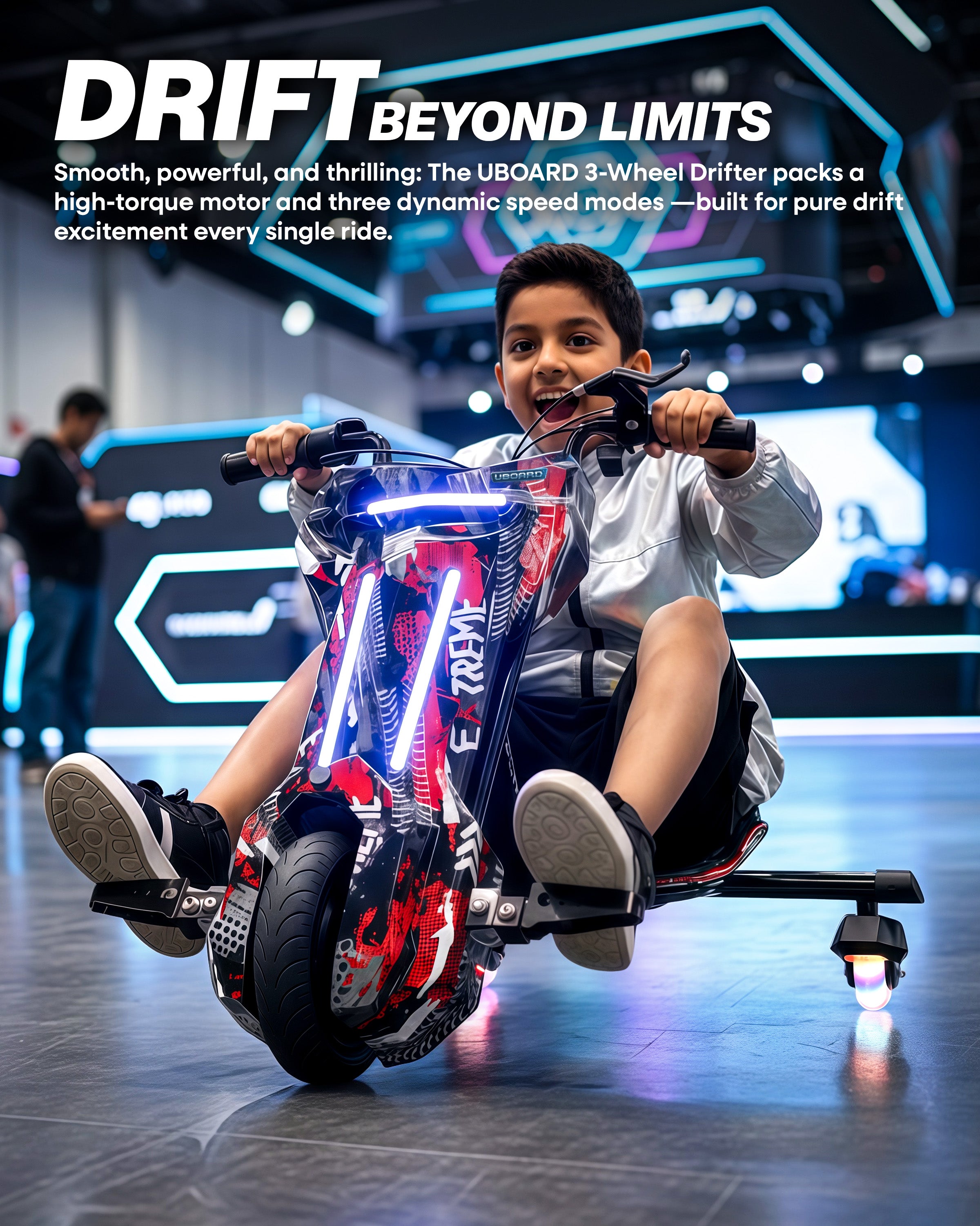 🔥 EXTREME PERFORMANCE MEETS DARING DESIGN The UBOARD 3-Wheel Drifter is built for thrill-seekers aged 6 and up, delivering heart-pounding spins and drifts with ease. Its sleek design and rugged build make it the ultimate ride for adrenaline-fueled fun.
