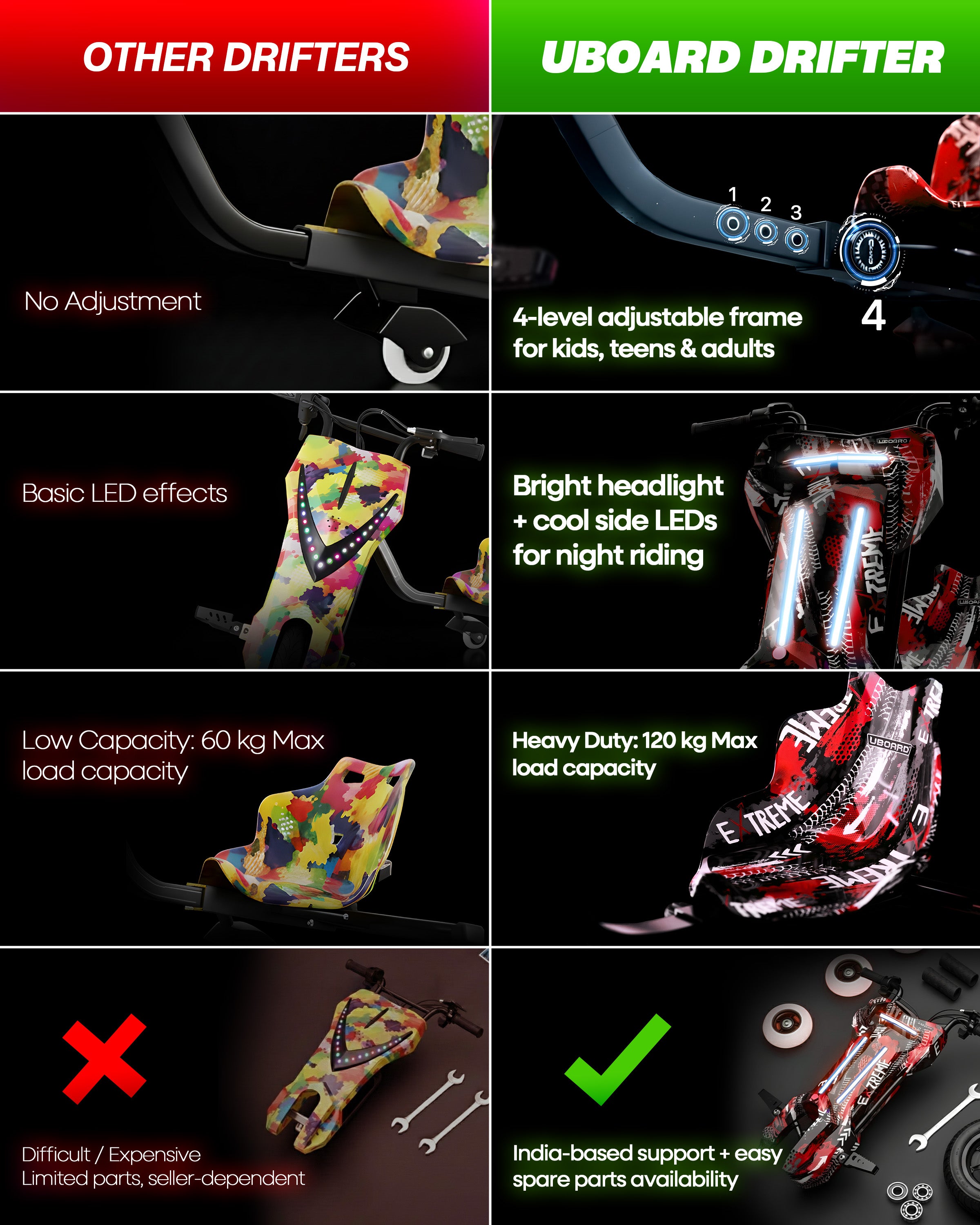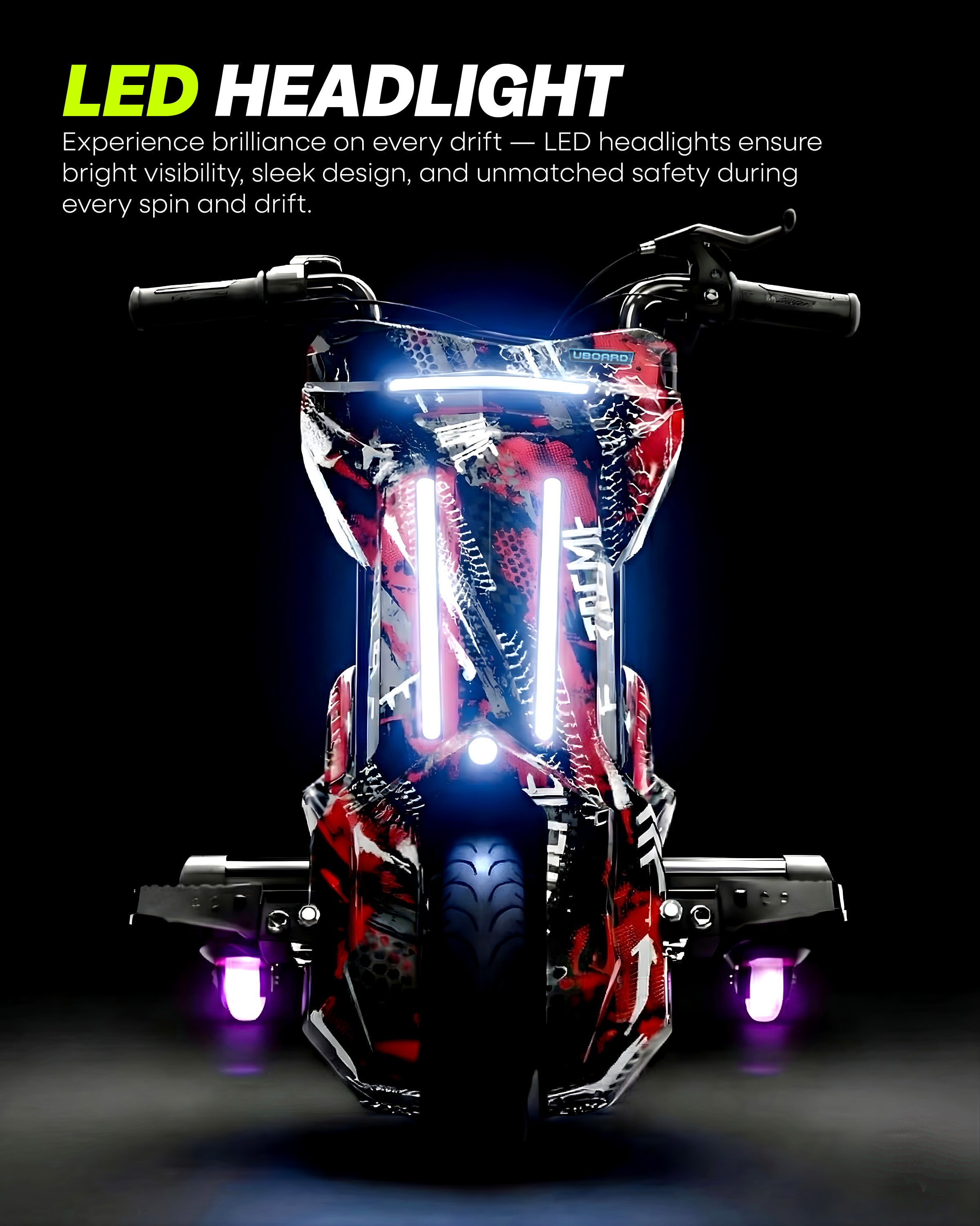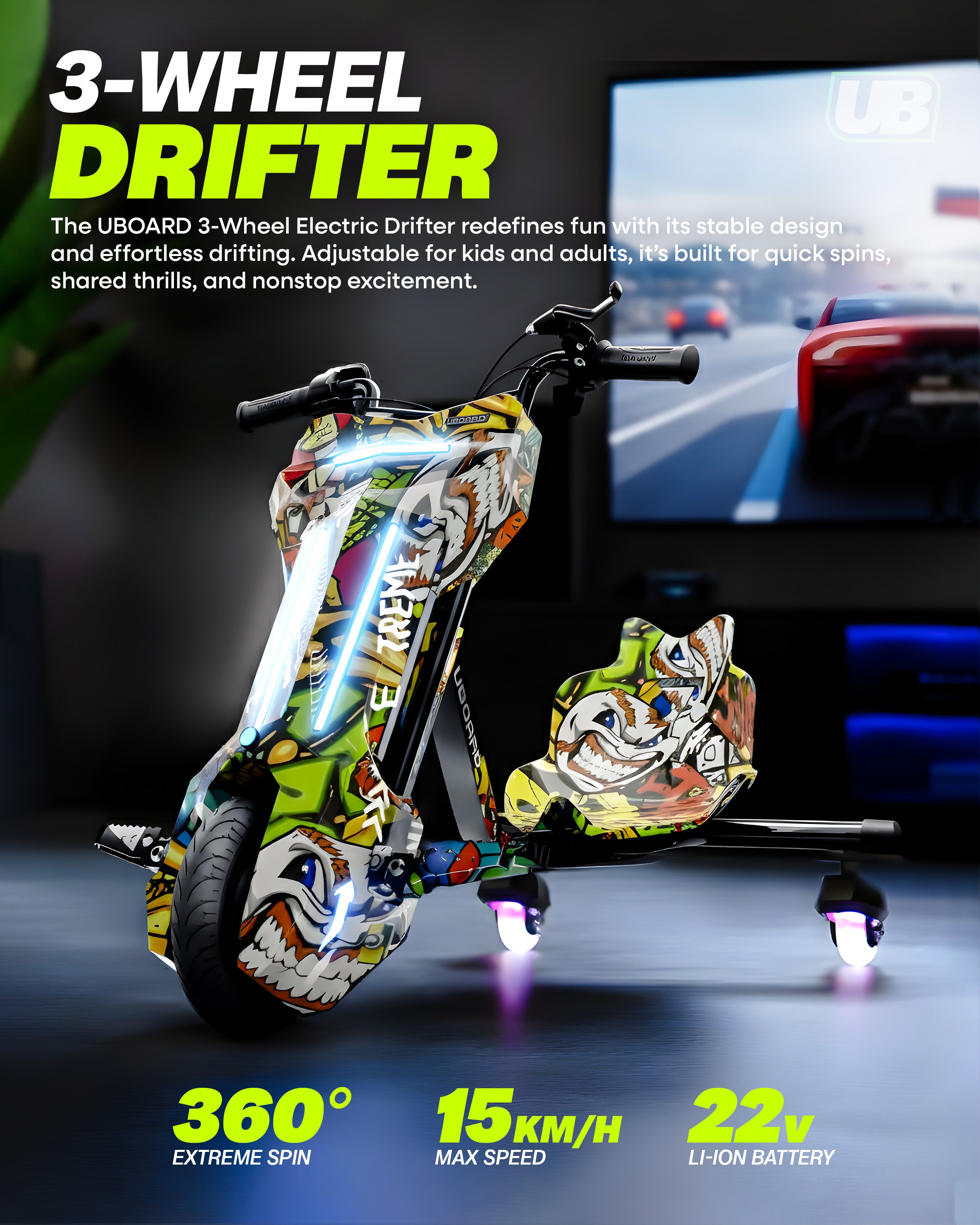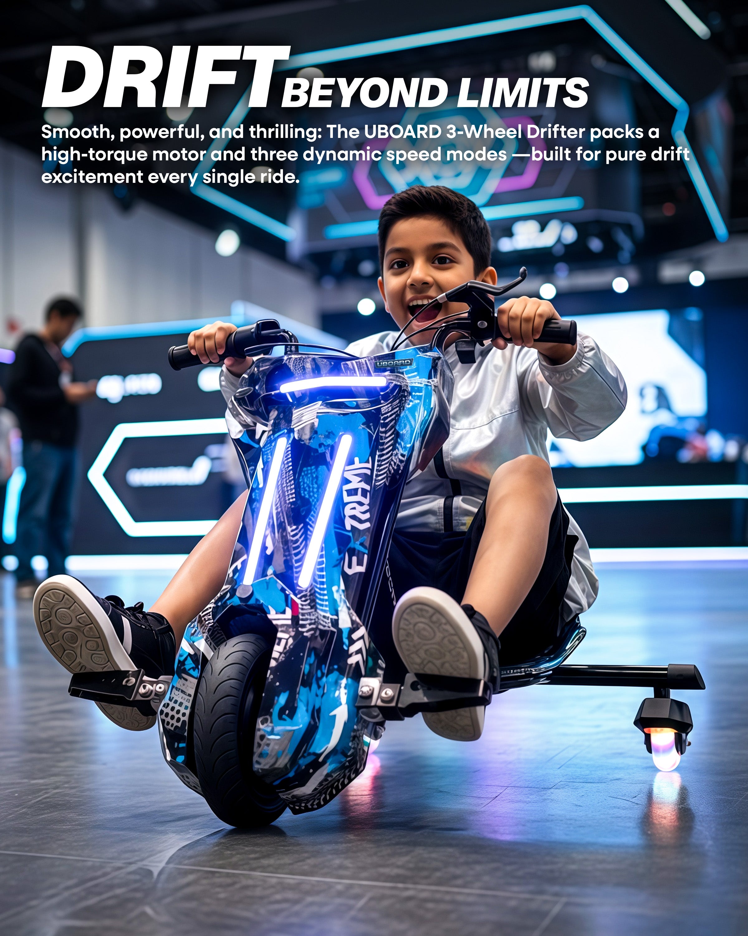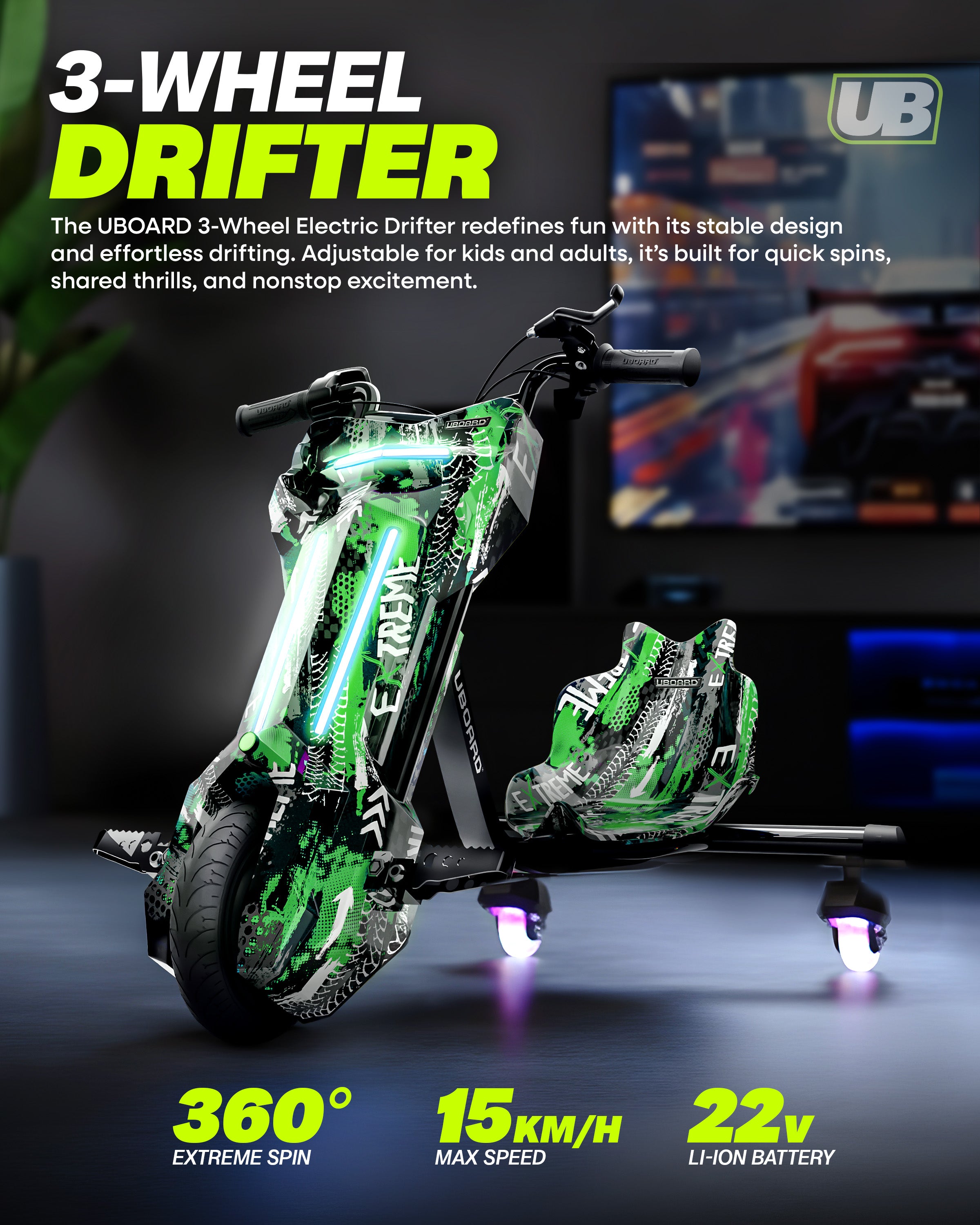 🔥 EXTREME PERFORMANCE MEETS DARING DESIGN The UBOARD 3-Wheel Drifter is built for thrill-seekers aged 6 and up, delivering heart-pounding spins and drifts with ease. Its sleek design and rugged build make it the ultimate ride for adrenaline-fueled fun.