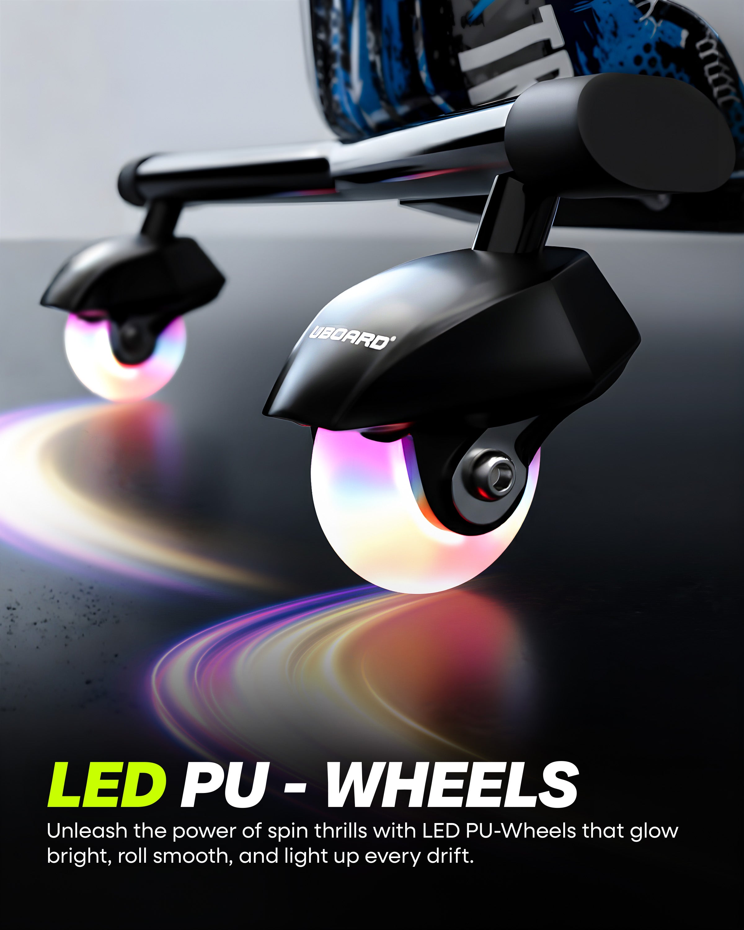 🎯 360° EXTREME DRIFTING ACTION Experience the rush of dual inclined caster wheels, allowing epic 360° spins and extreme drifting on any smooth surface—turn your neighborhood into a stunt arena!