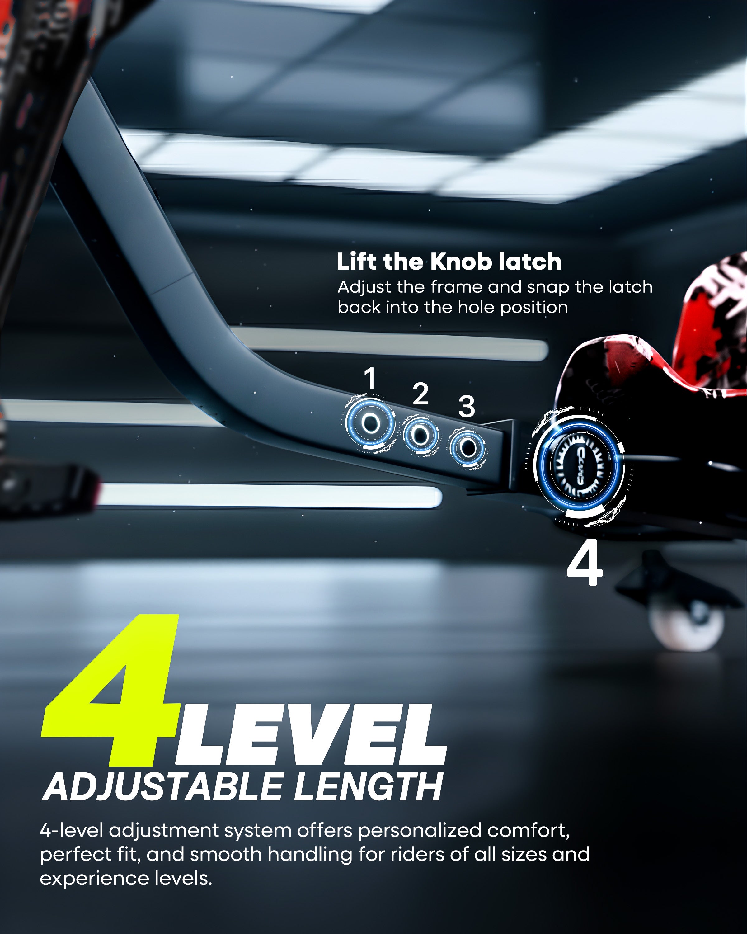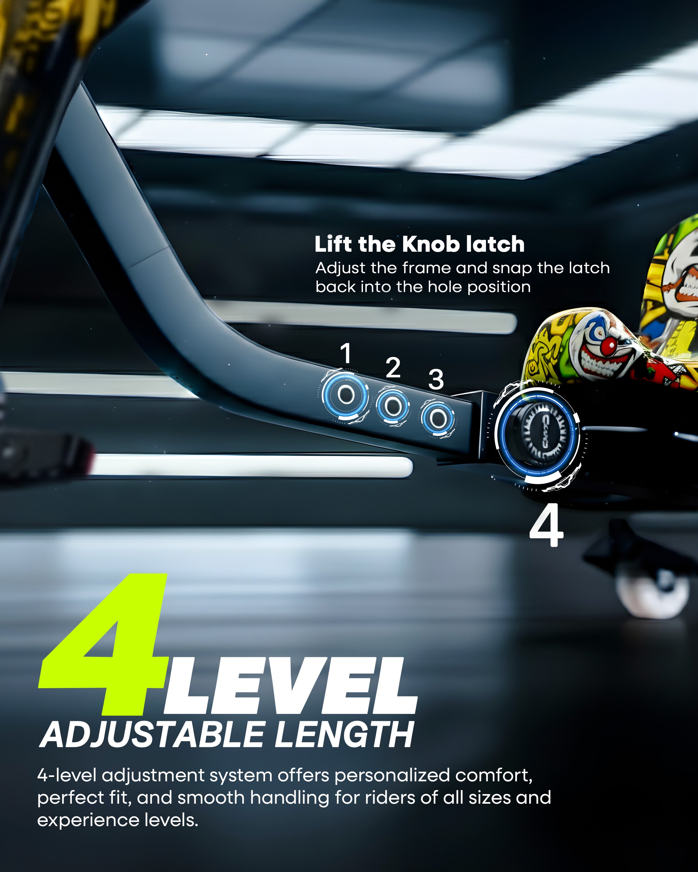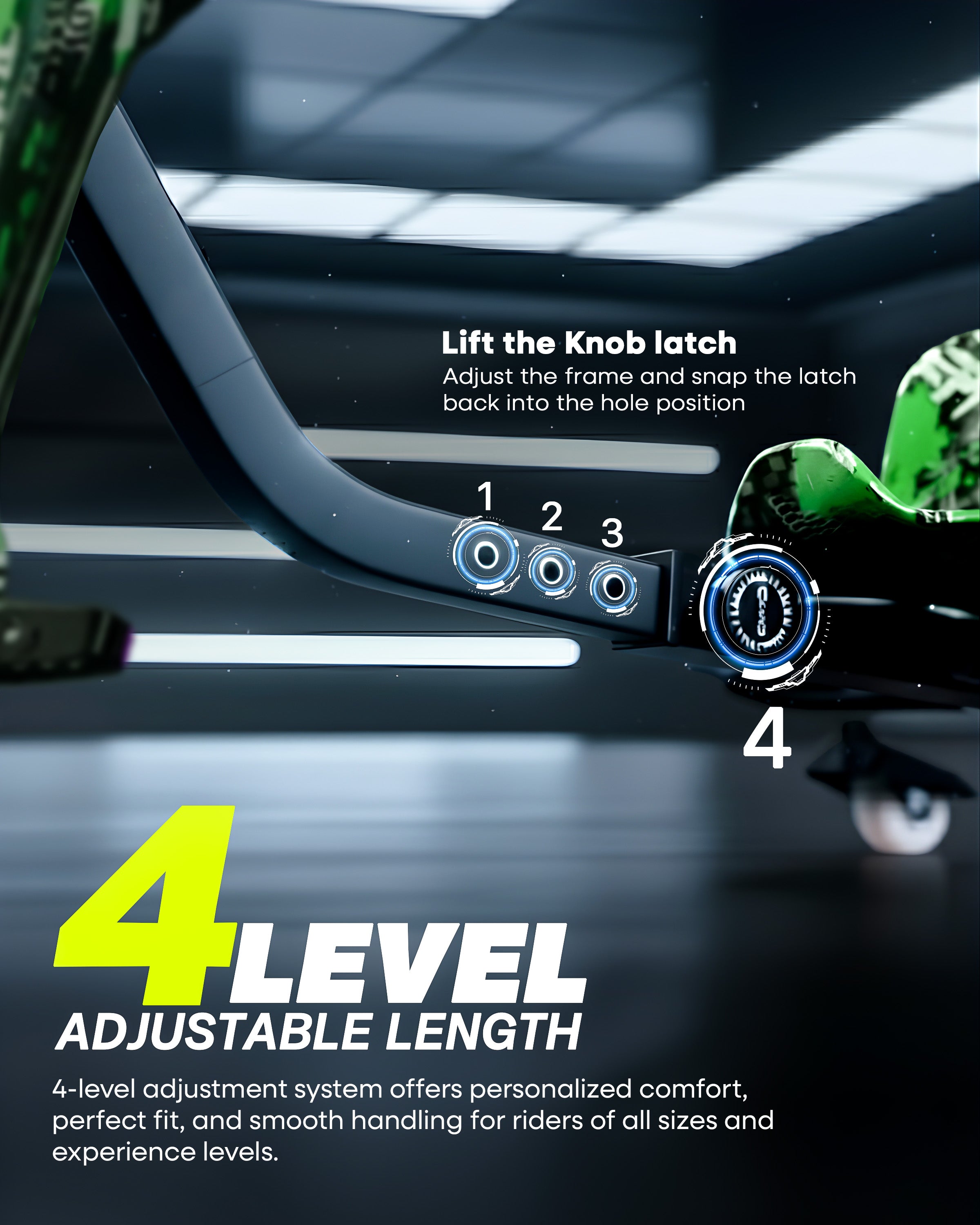 ⚙️ CUSTOMIZABLE FRAME FOR ALL RIDERS Designed for everyone, the adjustable frame features 4 length settings—ensuring the perfect fit for kids and adults alike. Personalize your ride and drift in comfort.